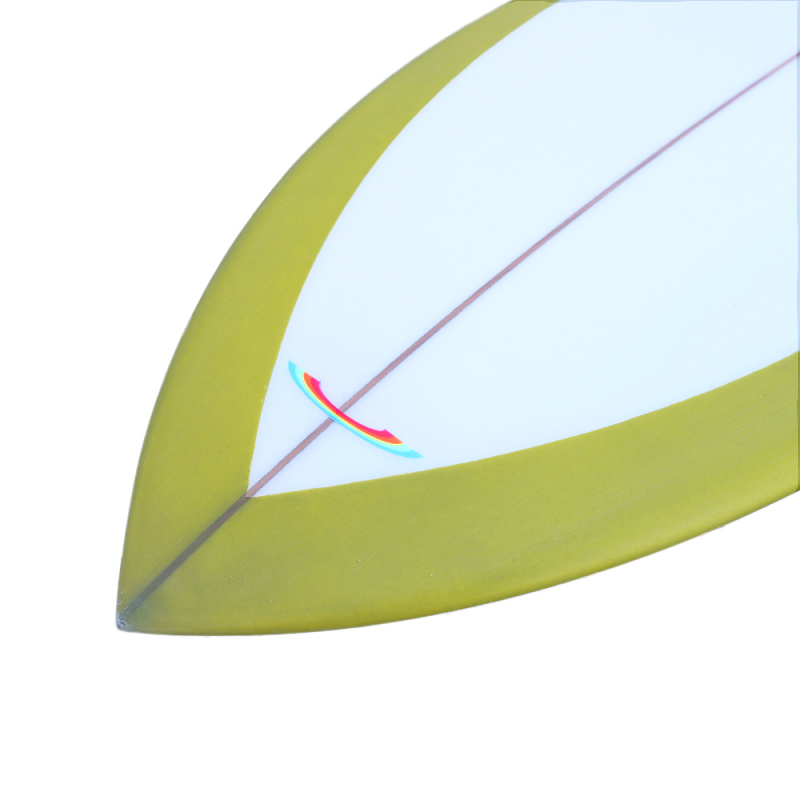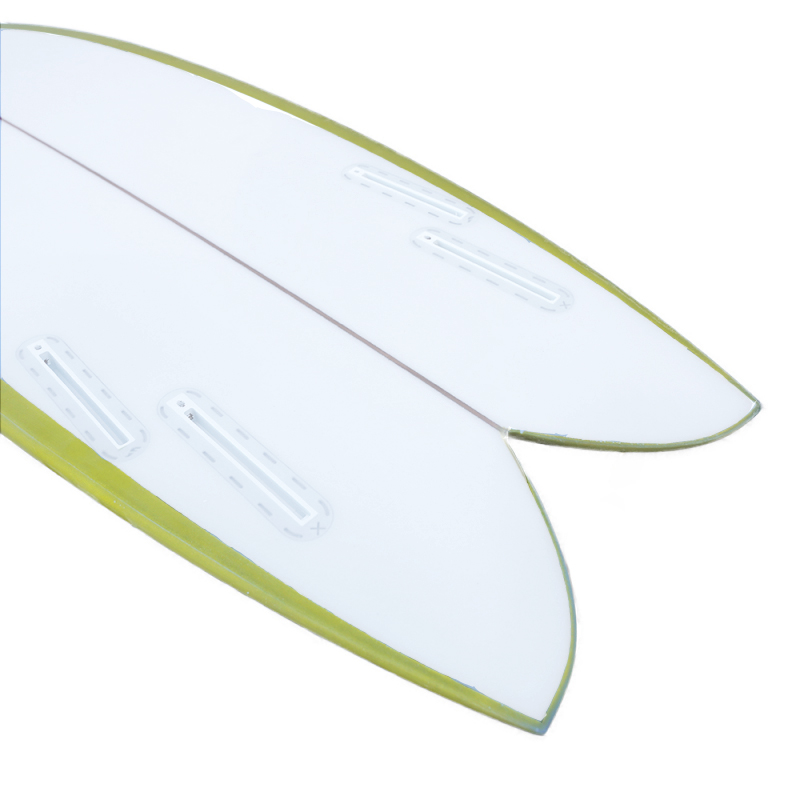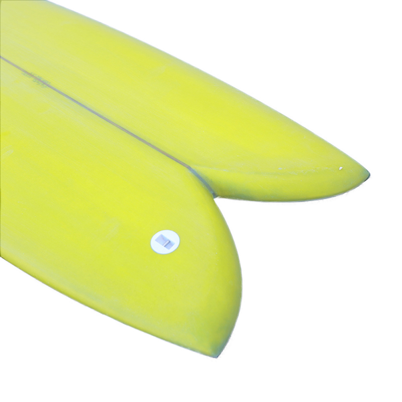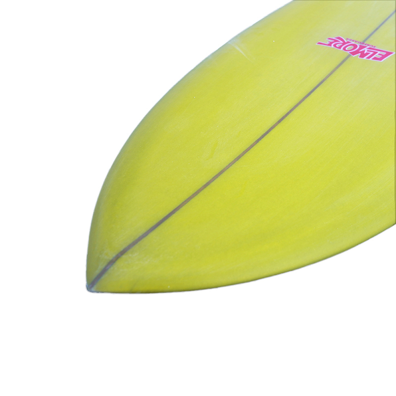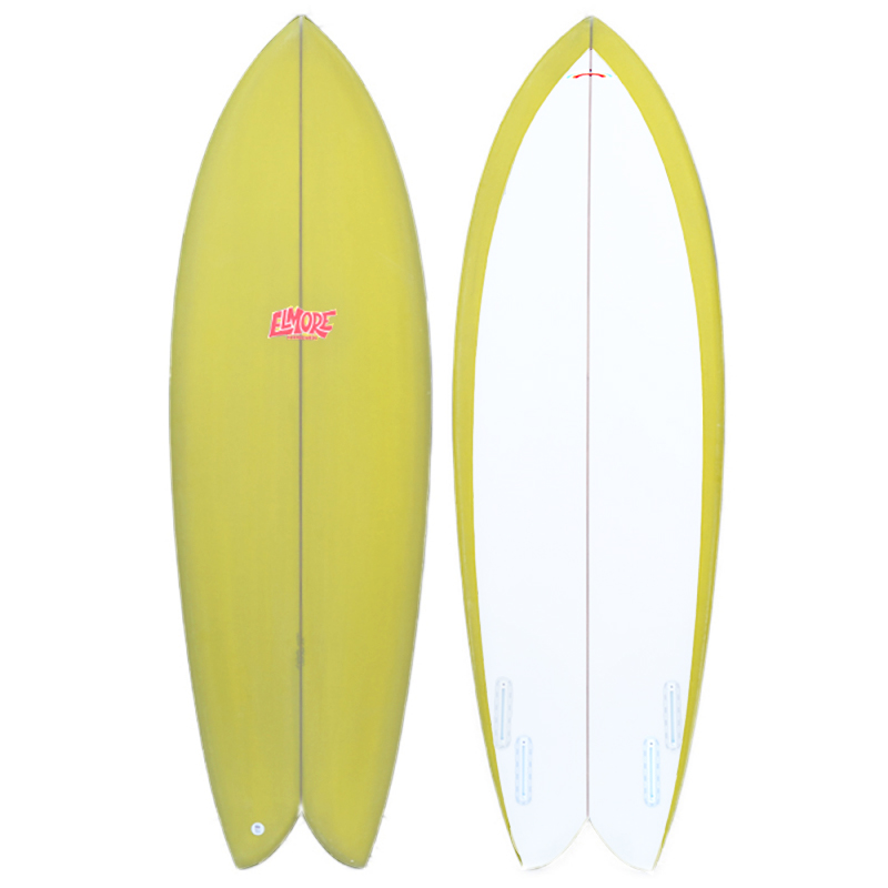 このボードはエルモアの代表作であるフライドフィッシュ(マイフィッシュとも呼ぶ)モデルがベースとなりますが、ルース感が特徴のツインフィン仕様のフライドフィッシュに比べ、より高速で走り、フィンが4枚になる事により、ターンはよりタイトで、コントロール性能もUPします。