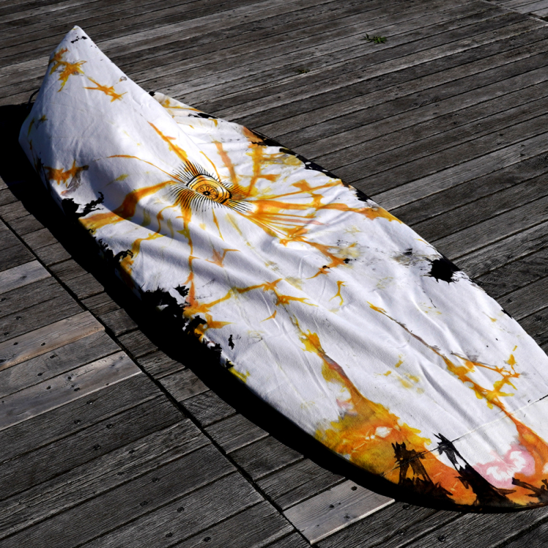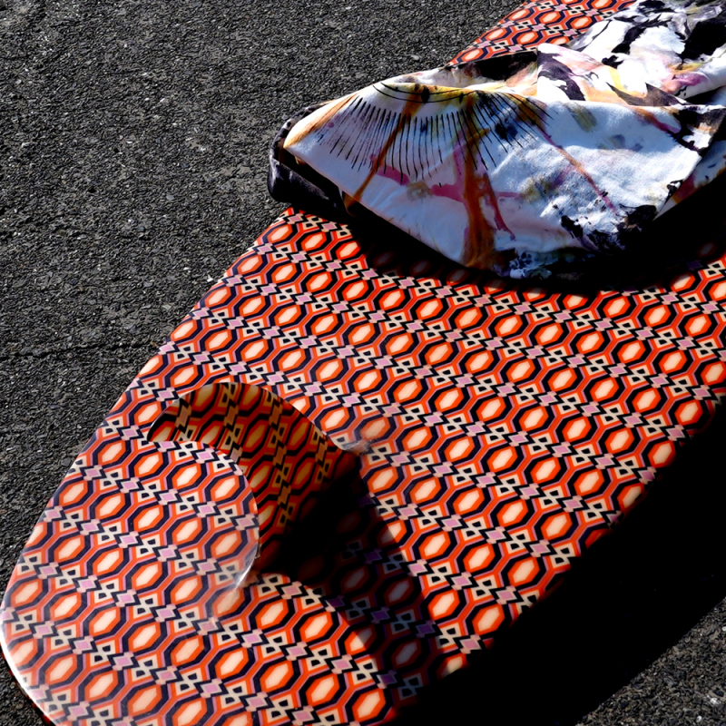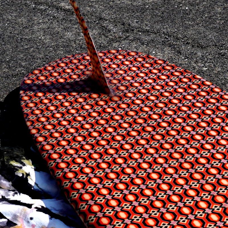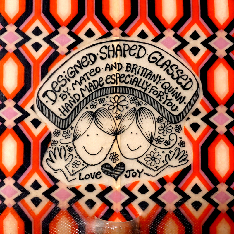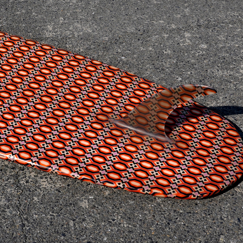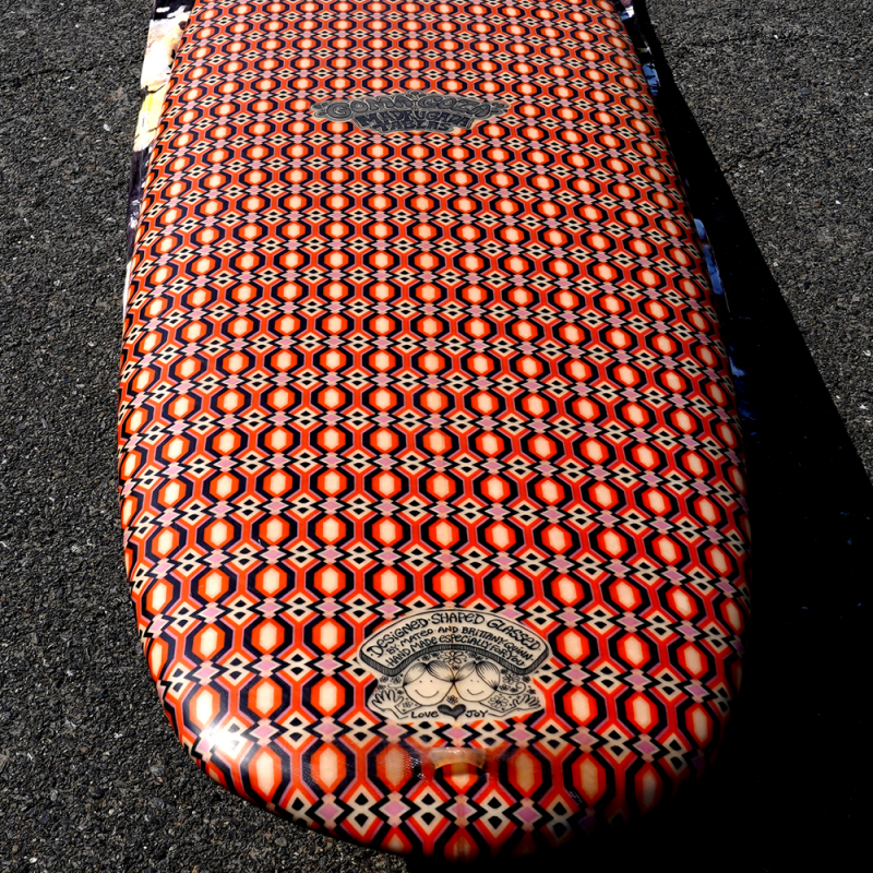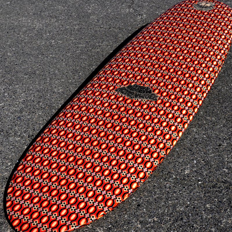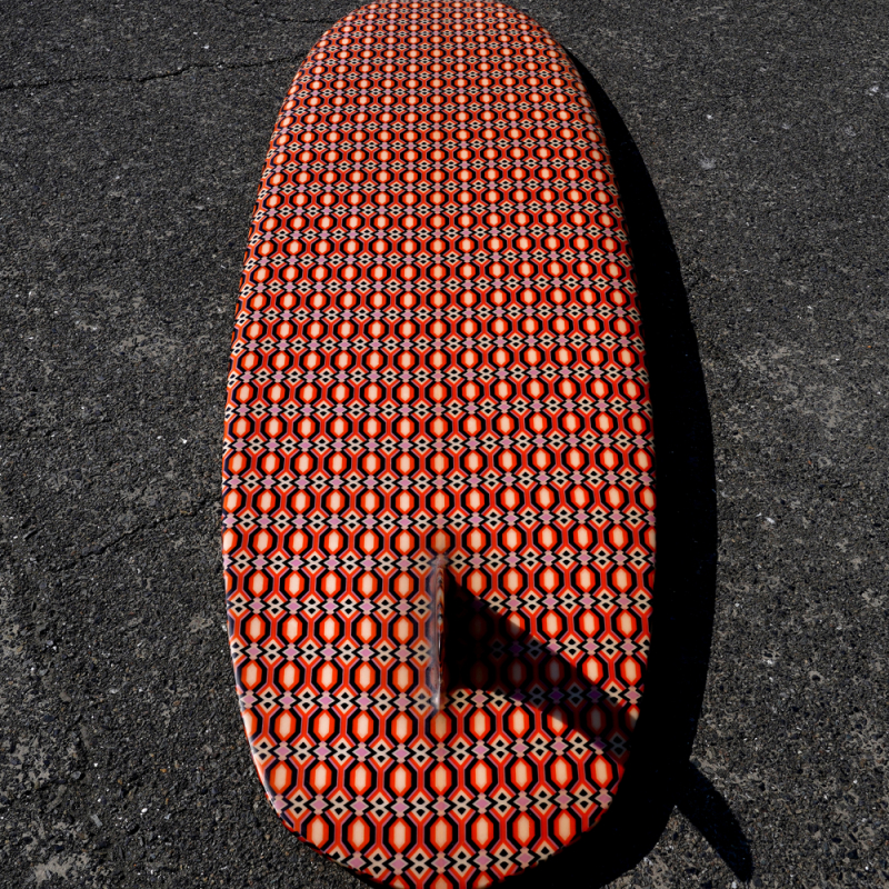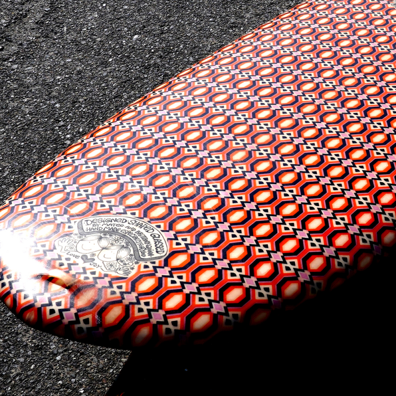 グラスオンフィン ヴィンテージファブリックラミネート アート by マテオ オールハンドメイド by マテオ&ブリタニー 【ゴマゴザ】 ミニシモンズタイプのワイドなアウトラインで小波から遊べるショートボードです。 ボトム面のフィンまわりには10本のチャンネルが施されています。 チャンネルによって生まれる独特な水流が至高の高速浮遊感をもたらします。 抑えられたロッカーと十分なボリューム、ファブリックとボランクロスの重量感、 大きなフィンでいっきに加速してからのチーターファイブも容易です。