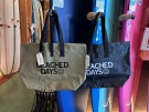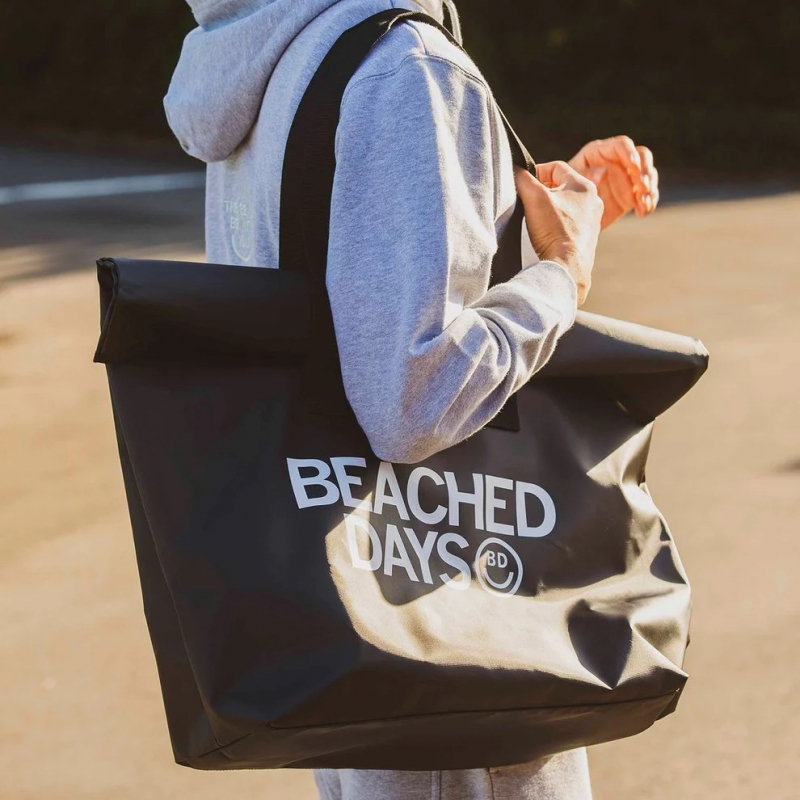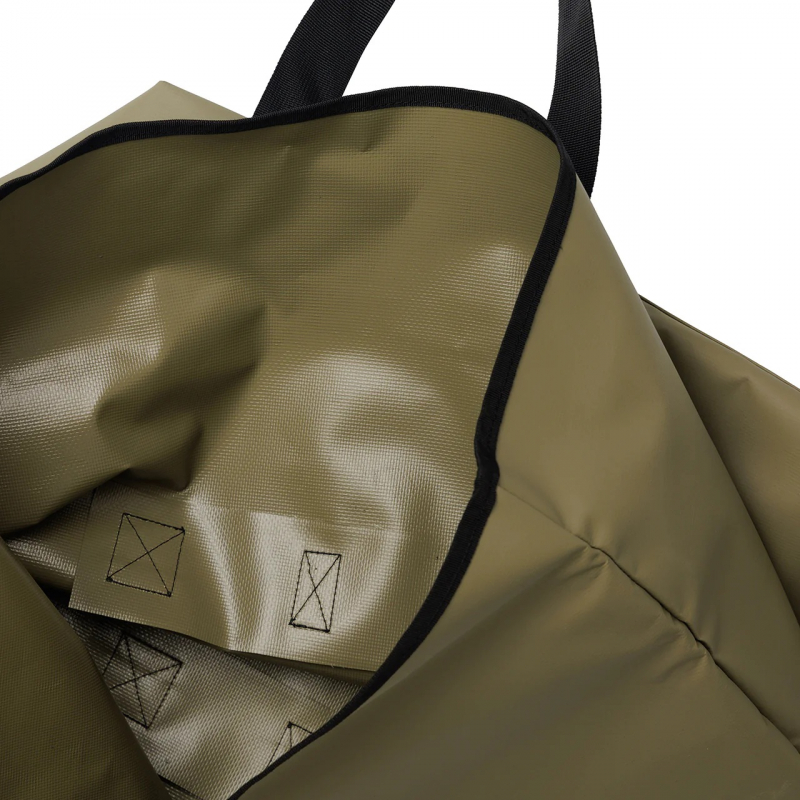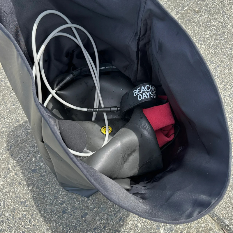 水に強く、丈夫なターポリン生地で濡れた水着やウエットスーツ等のサーフギアやタオルやキャンプギアを気にせず収納できる、55リッターの大容量のトートバッグ。