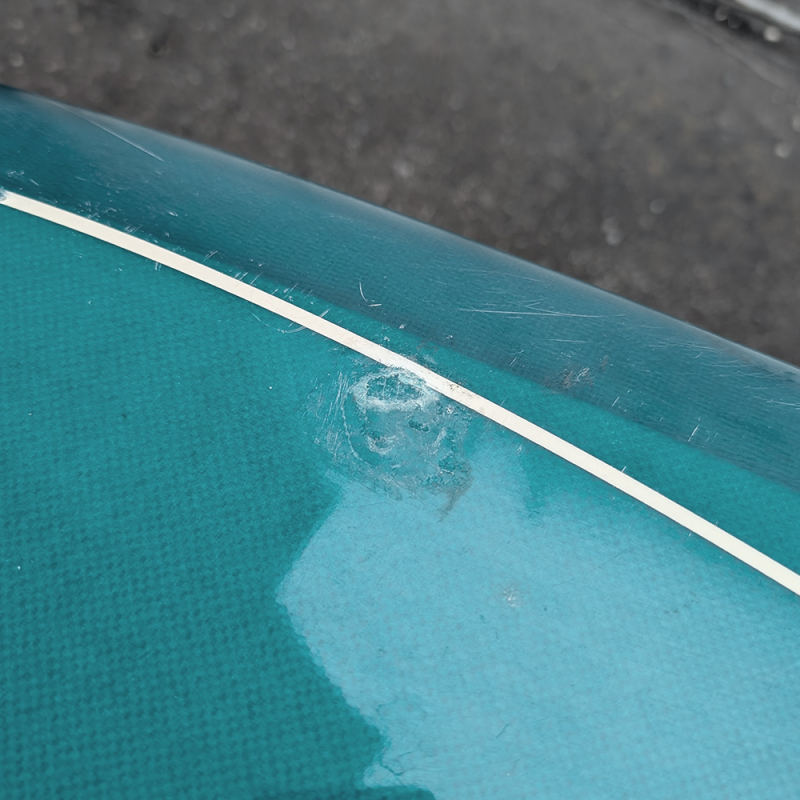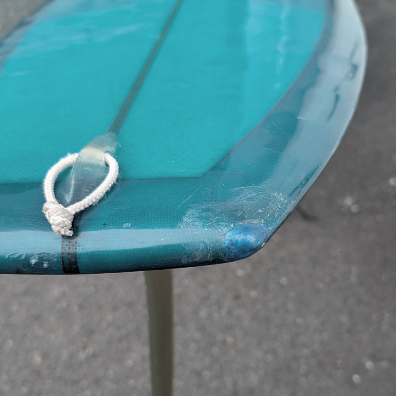 全体的に使用感があり、フットマーク、デッキとボトムの凹み、各所にリペア痕や中割れ、軽いクラック、フィンの擦れがあります。
