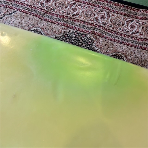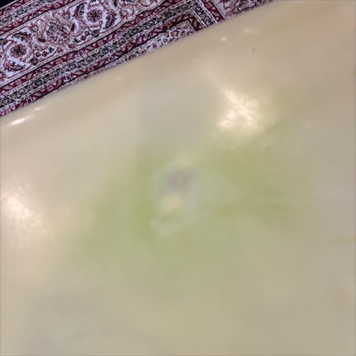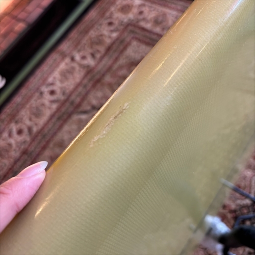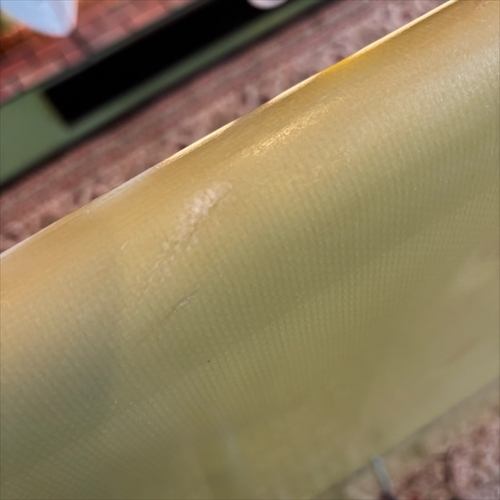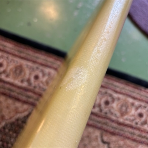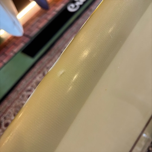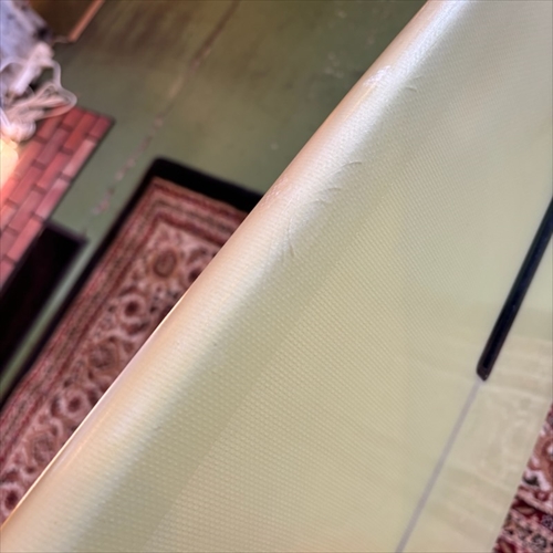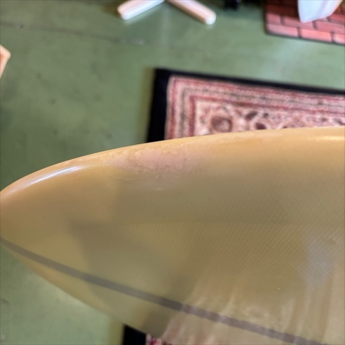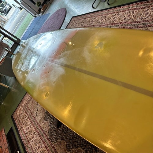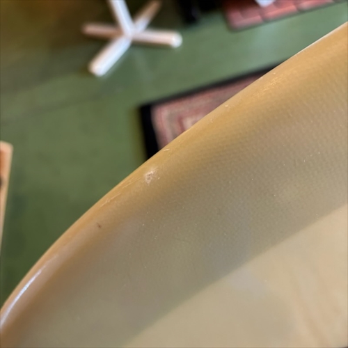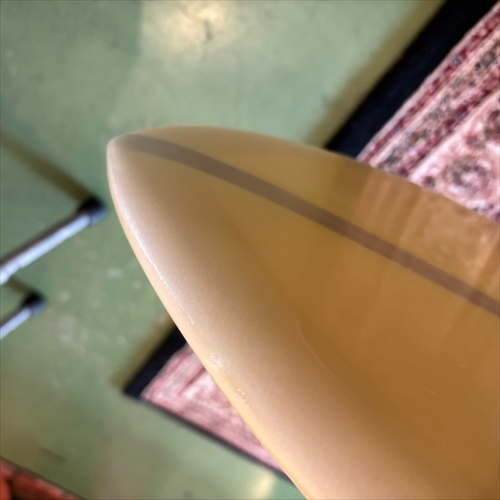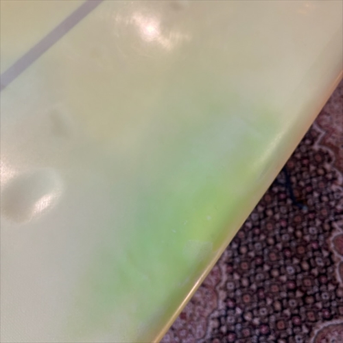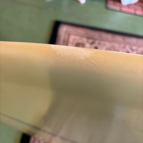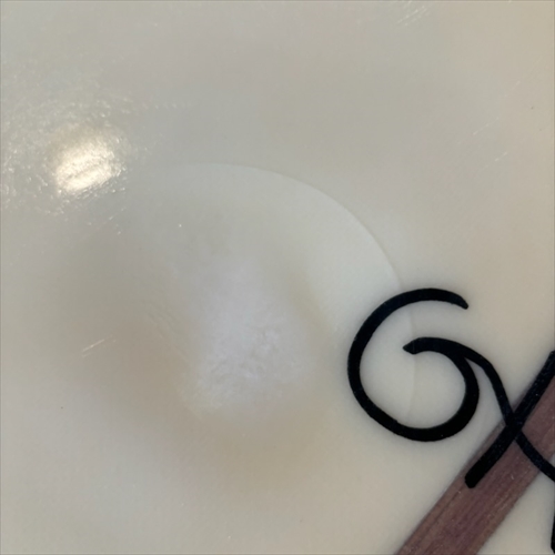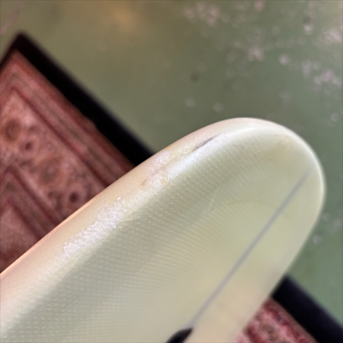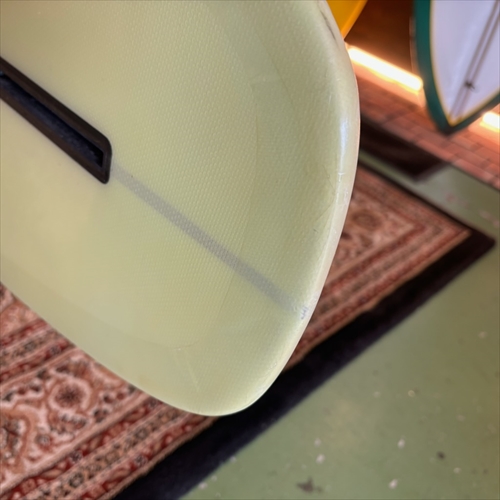 デッキ面に多数のフットマークがあり、ボトム面のくぼみも多数ついております。デッキ面、ボトム面、レール周り、テール部分、ノーズ周りにリペア痕ございます。浸水の心配はございません。デッキ面、ボトム面、テール部分に円弧状のクラックがあります。全てソーラーレジンで修復してからのご使用をオススメします。