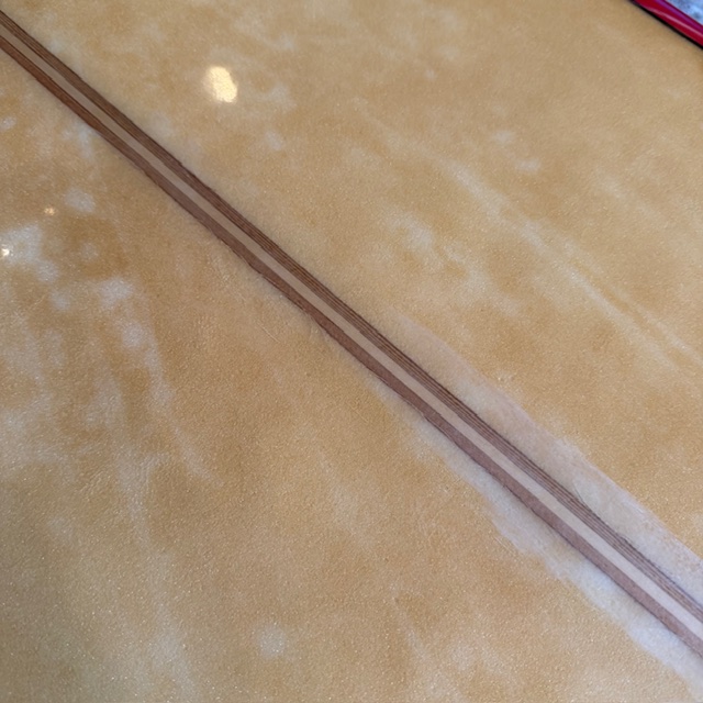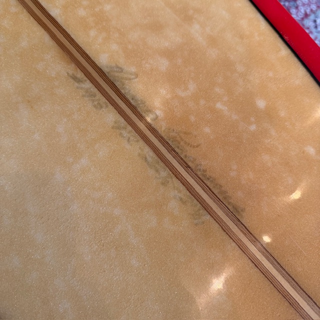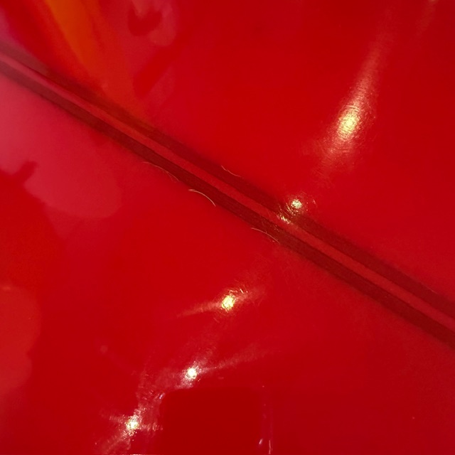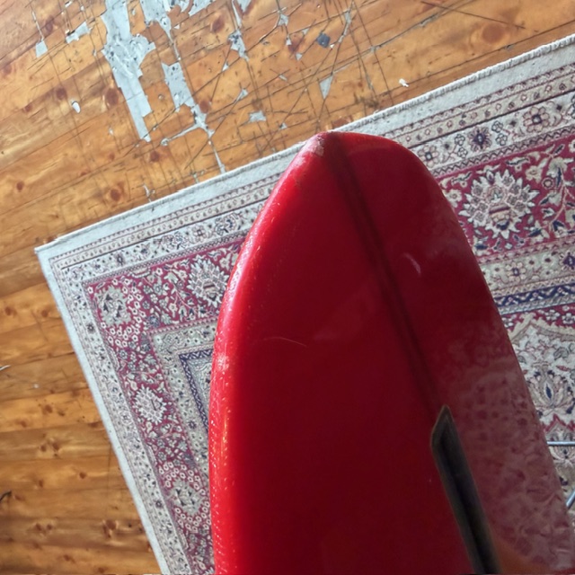 デッキ面にフットマーク、フットマークによるストリンガー沿いのクラック・大きな当てキズ、ボトム面にストリンガー沿いのクラック大小の当てキズとそのセルフリペア痕・フィンBOXのクラック・グラスオンされたサイドフィン周りにクラック、レール周りに当てキズ・クラック・リペア痕がございます。