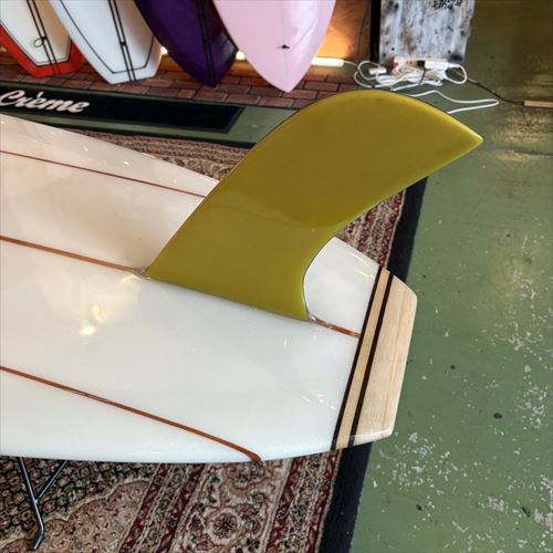 こちらのボードは3ストリンガーにウッドテールブロック、さらにイエローのオンフィン仕様。クラシック感を際立たせた豪華な仕上がりとなっています。