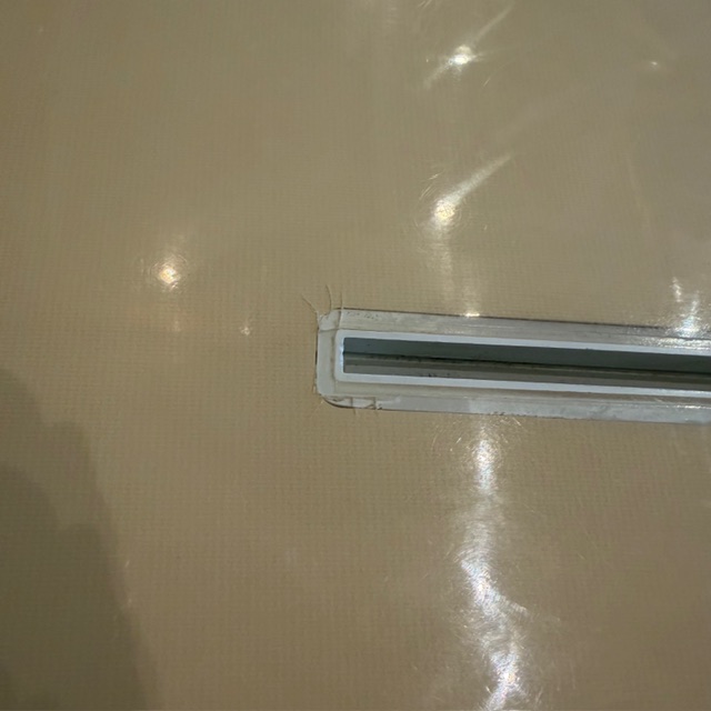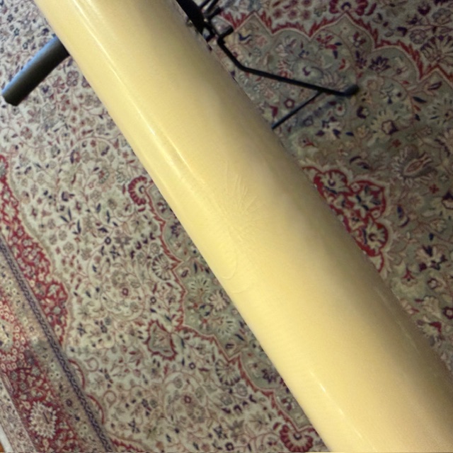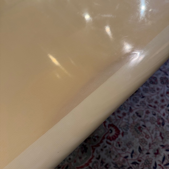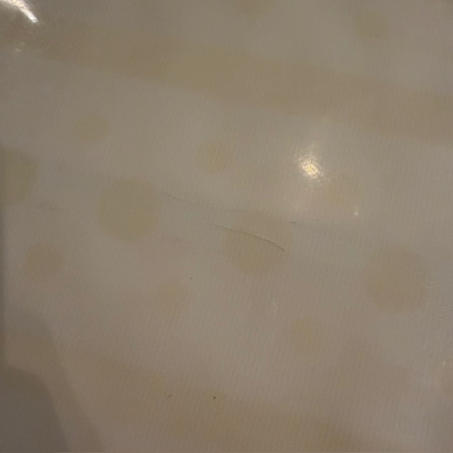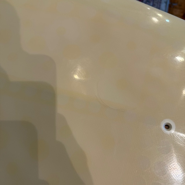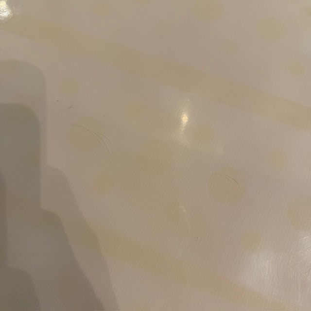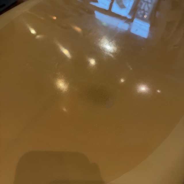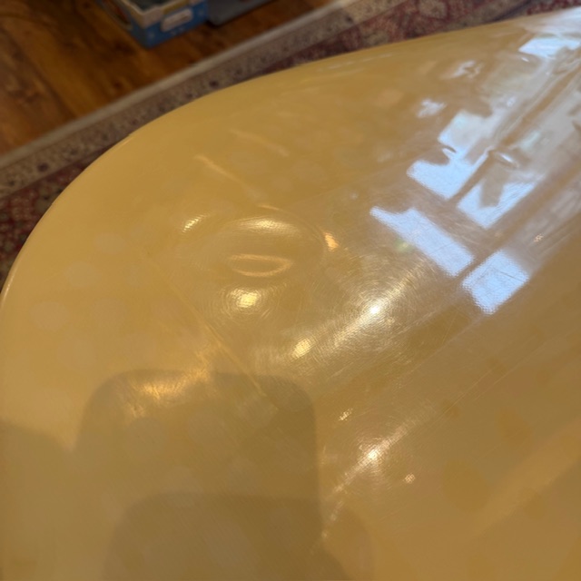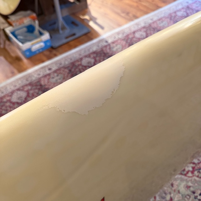 デッキ面にフットマークと滑り止めシートの日焼け、レール周り当てキズやクラックとそのリペア痕、ボトム面に大小の凹みが数箇所あります。