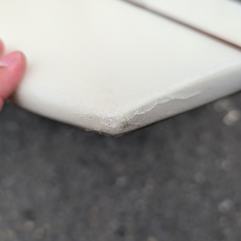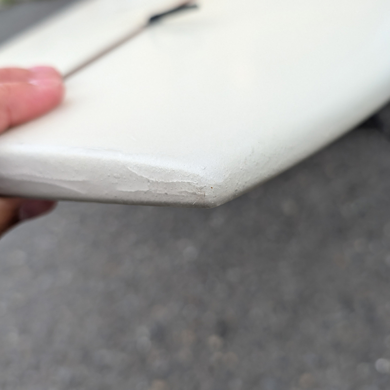 全体的に使用感があり、日焼け、フットマーク、デッキとボトムの凹み、テールのクラック、ストリンガー沿いのクラック、ノーズのクラック、レールにリペア痕、ボトム、レールに複数のクラック(テープにて補強済み)があります。