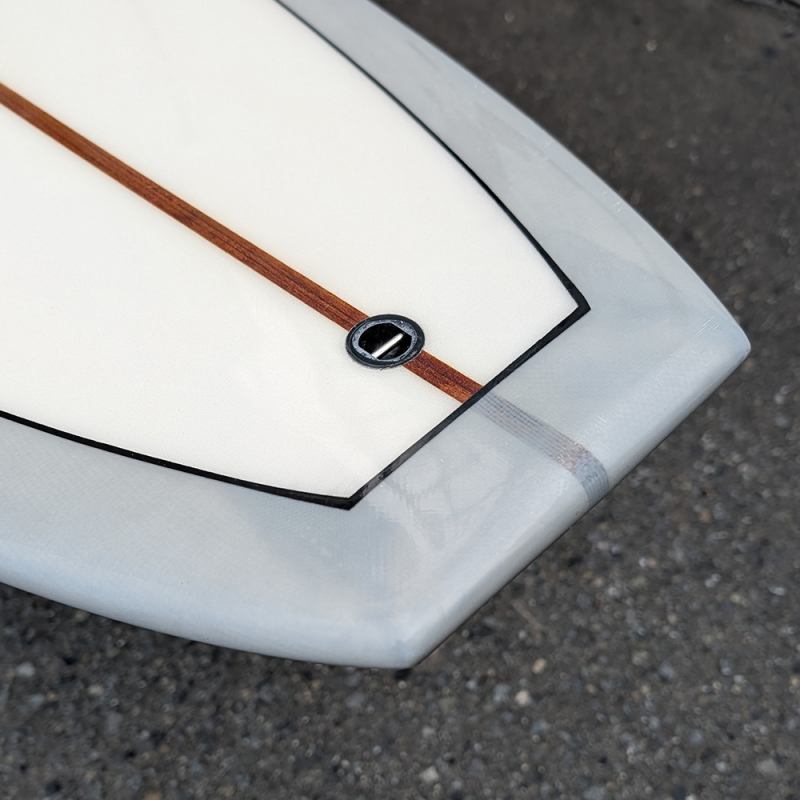 テールが最大幅に近くストレートにカットされているサーフボード創世記の形状です