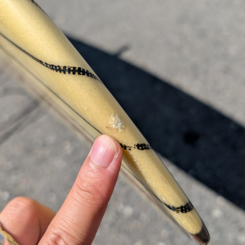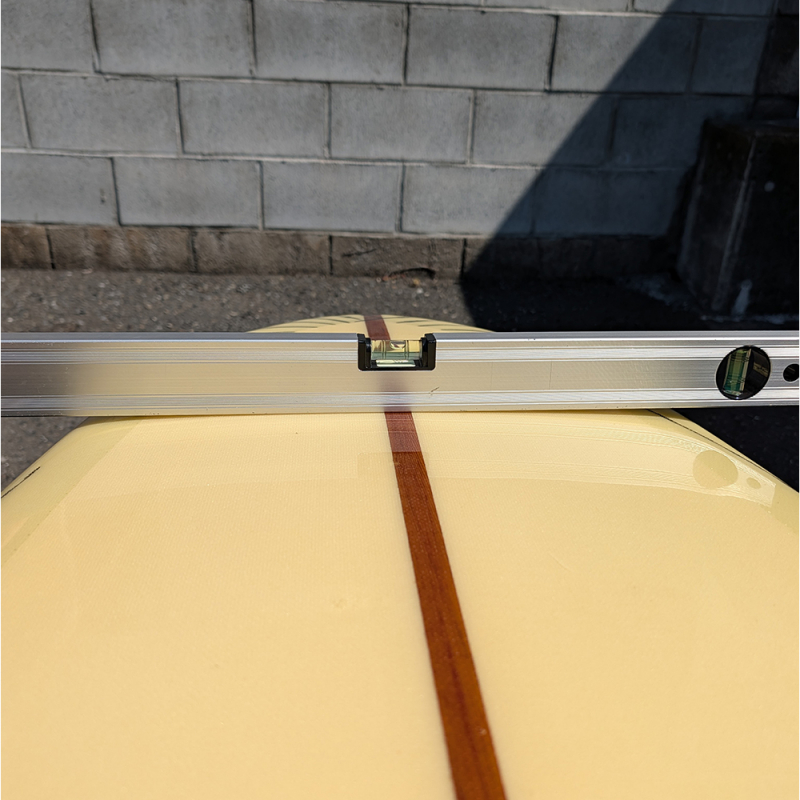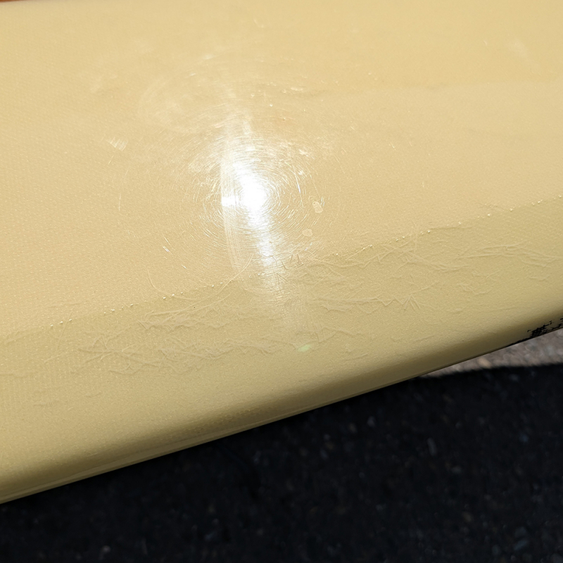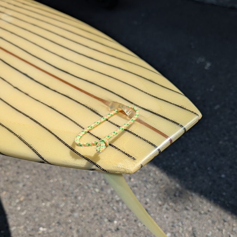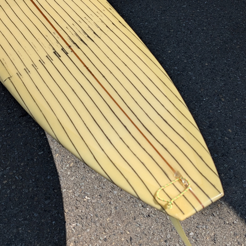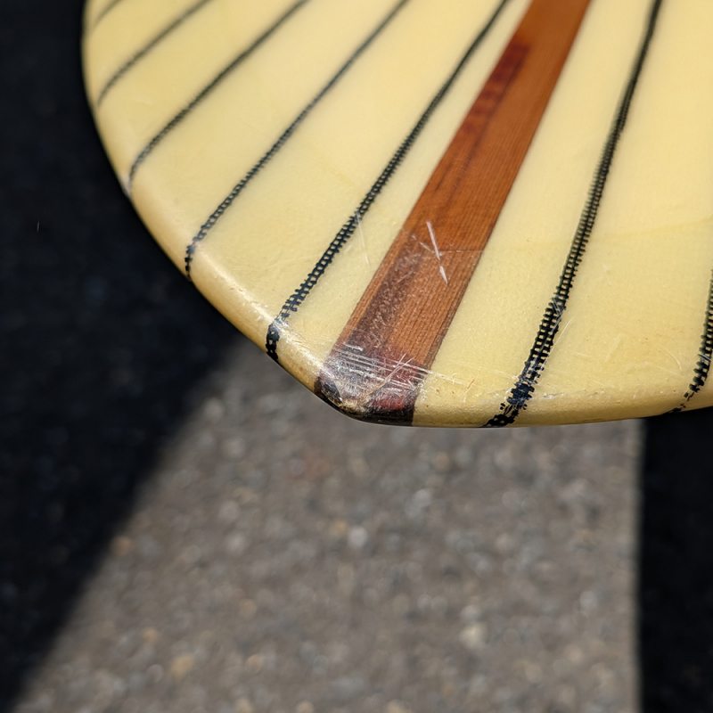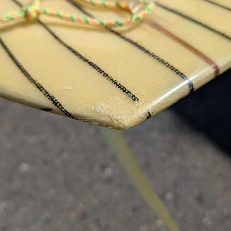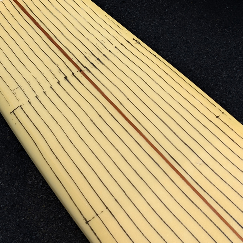 全体にやや使用感があり、日焼け、フットマーク、デッキとボトムの凹み、リペアが必要なストリンガー沿いのクラックがあります。