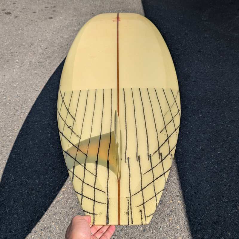 テールが最大幅に近くストレートにカットされているサーフボード創世記の形状です