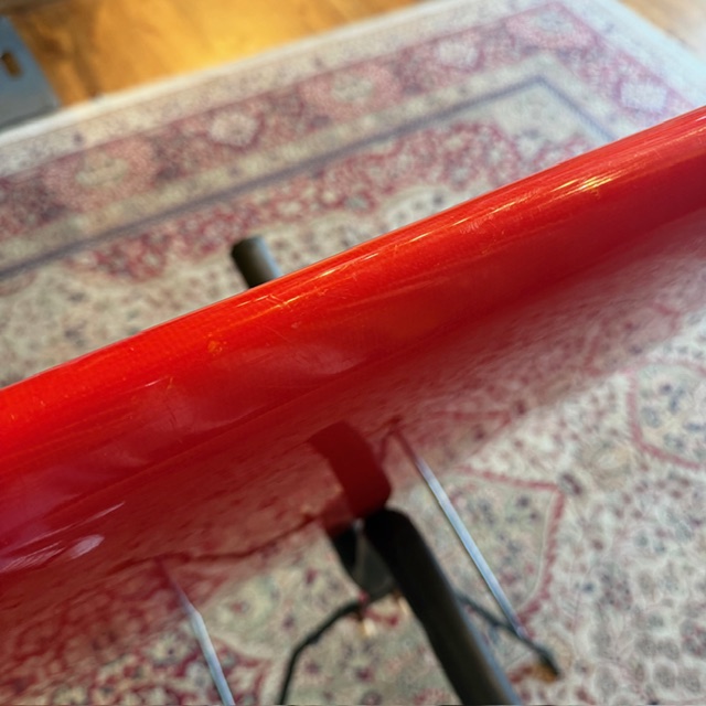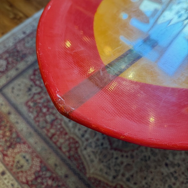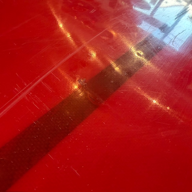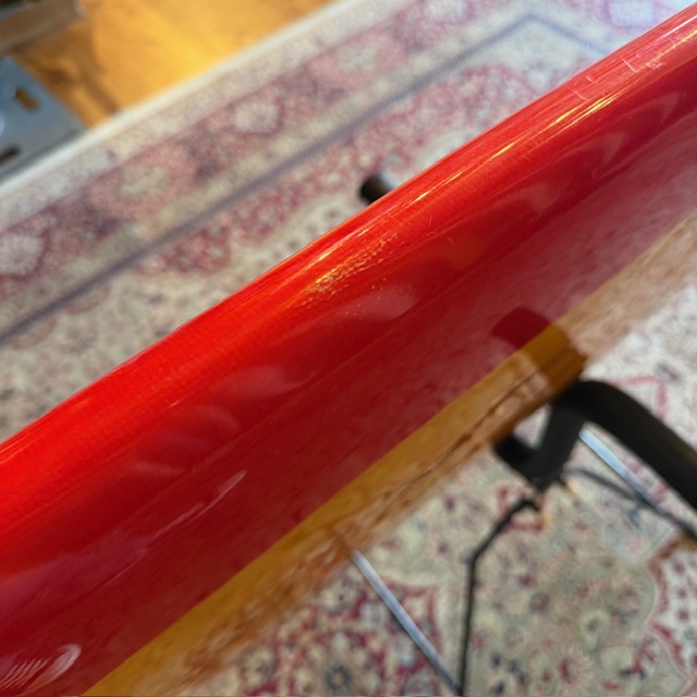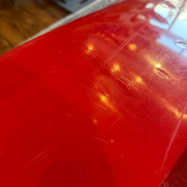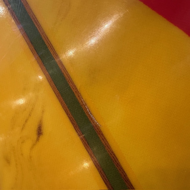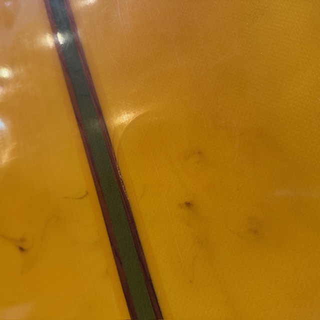 デッキ面にフットマーク、フットマークによるストリンガー沿いのクラック、ボトム面にリペア痕が数箇所、レース周りに当てキズやクラック・リペア痕などがあります。