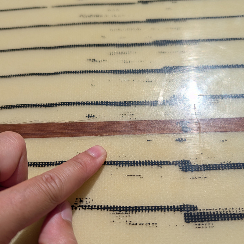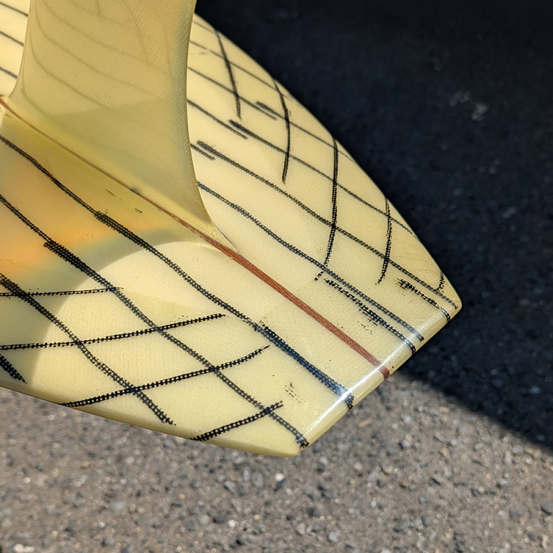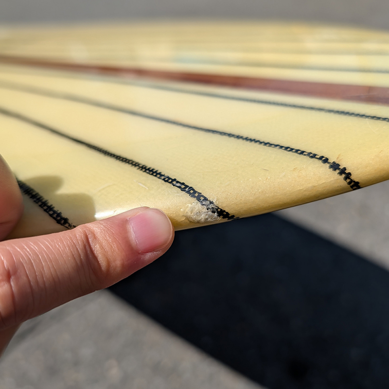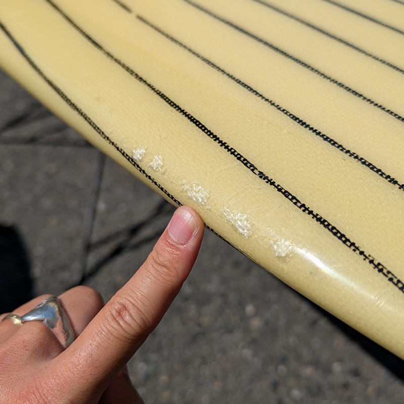 全体にやや使用感があり、日焼け、フットマーク、デッキとボトムの凹み、リペアが必要なストリンガー沿いのクラックがあります。