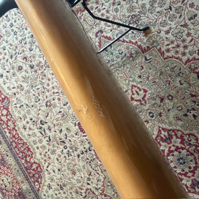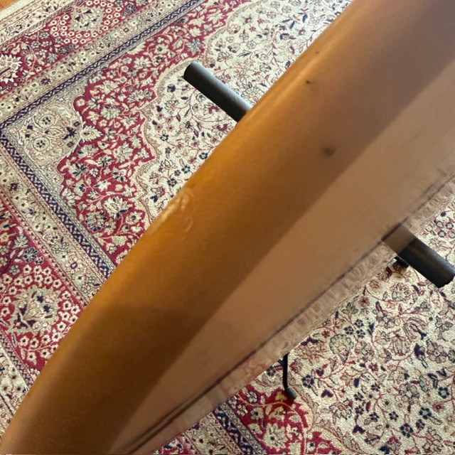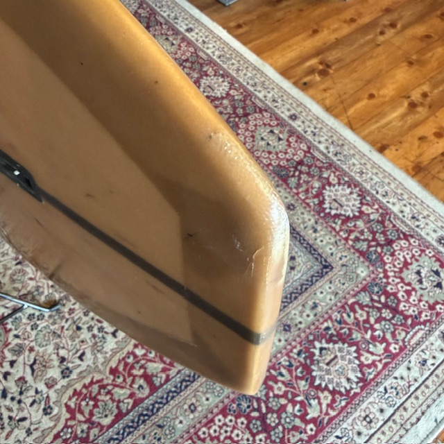 デッキ面にフットマーク、フットマークによるストリンガー沿いのクラックとプロショップによるリペア痕、テール・レール周りに写真のような複数個所の当てキズやクラック、ボトム面に大小の凹みとフィンBOXにヒゲがございます。