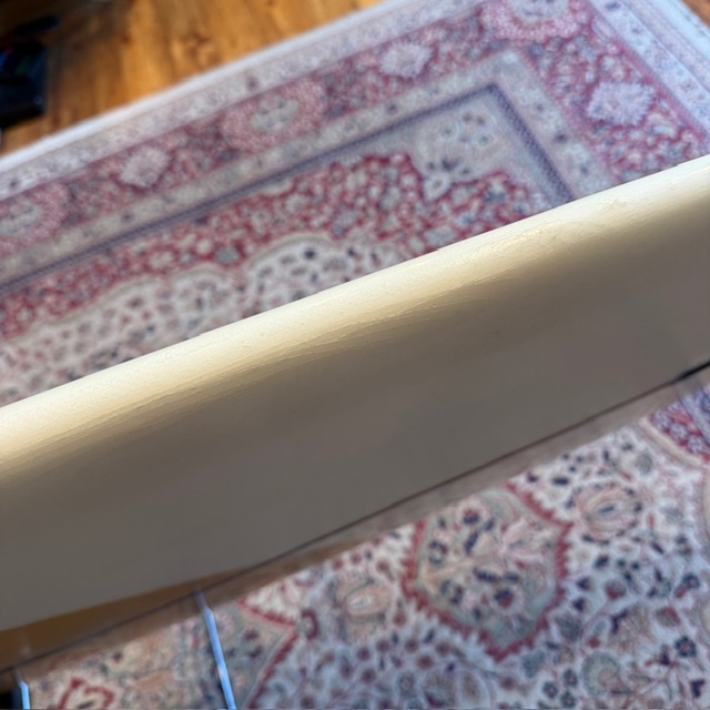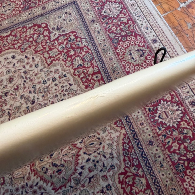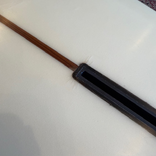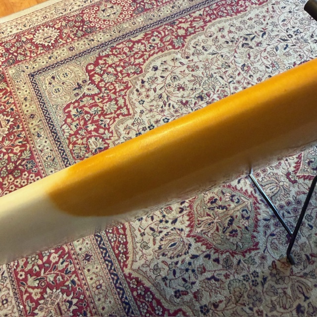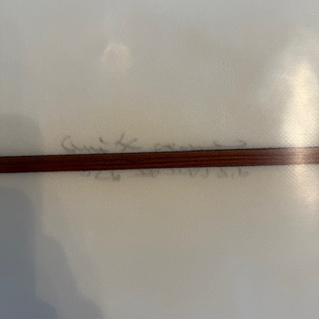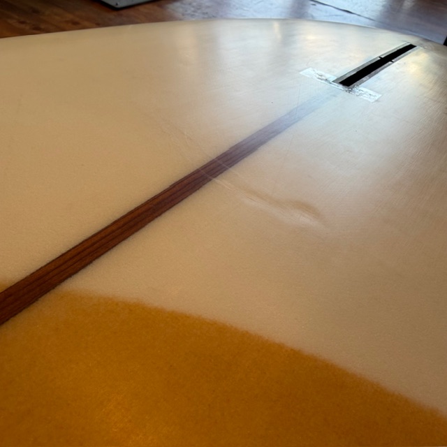 デッキ面にフットマーク、フットマークによるストリンガー沿いのクラック、レール周りに当てキズやクラックのセルフリペア痕、ボトム面はキレイで細かな凹みが少しとフィンBOXのヒゲがございます。