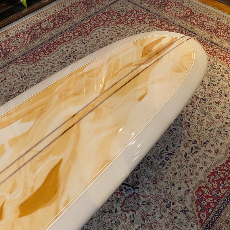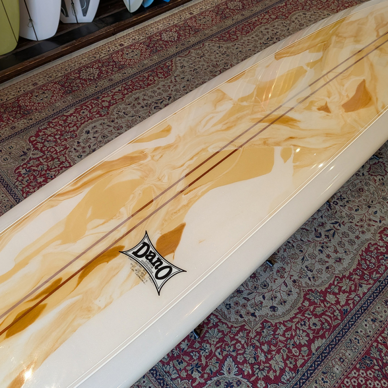 カリフォルニア、コスタメサの重鎮ダノーがハンドシェープし、今では珍しいボトム面にアブストラクト&ピンラインが施されたこだわりのお洒落な一本です。