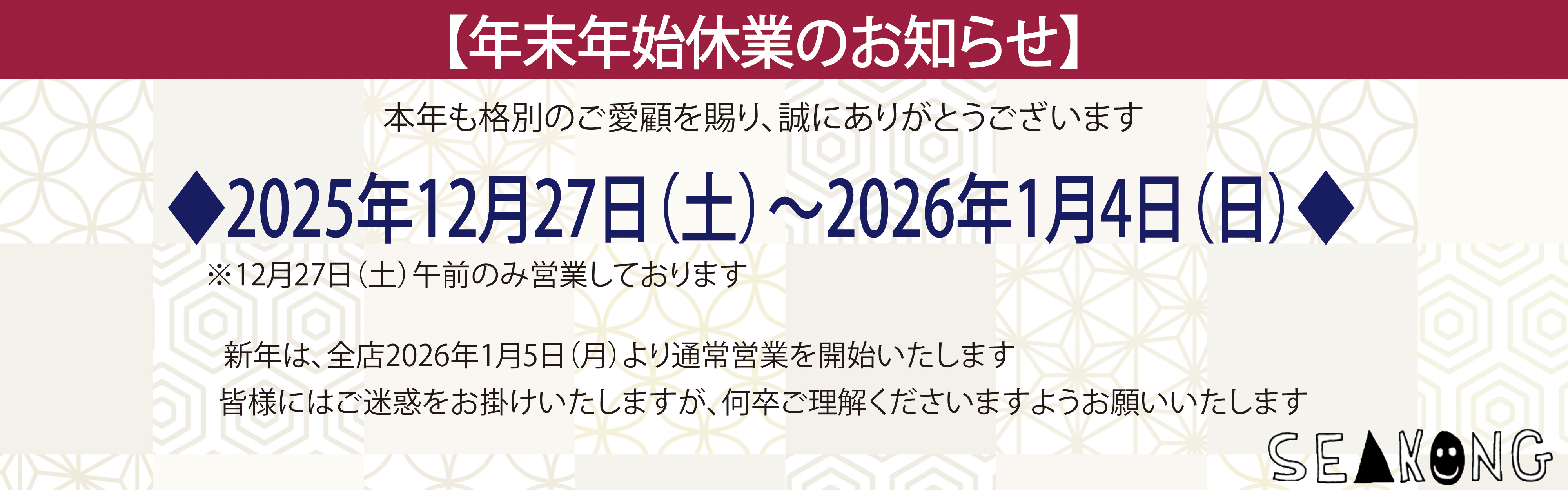 ※12月27日(土)午前のみ営業しております。